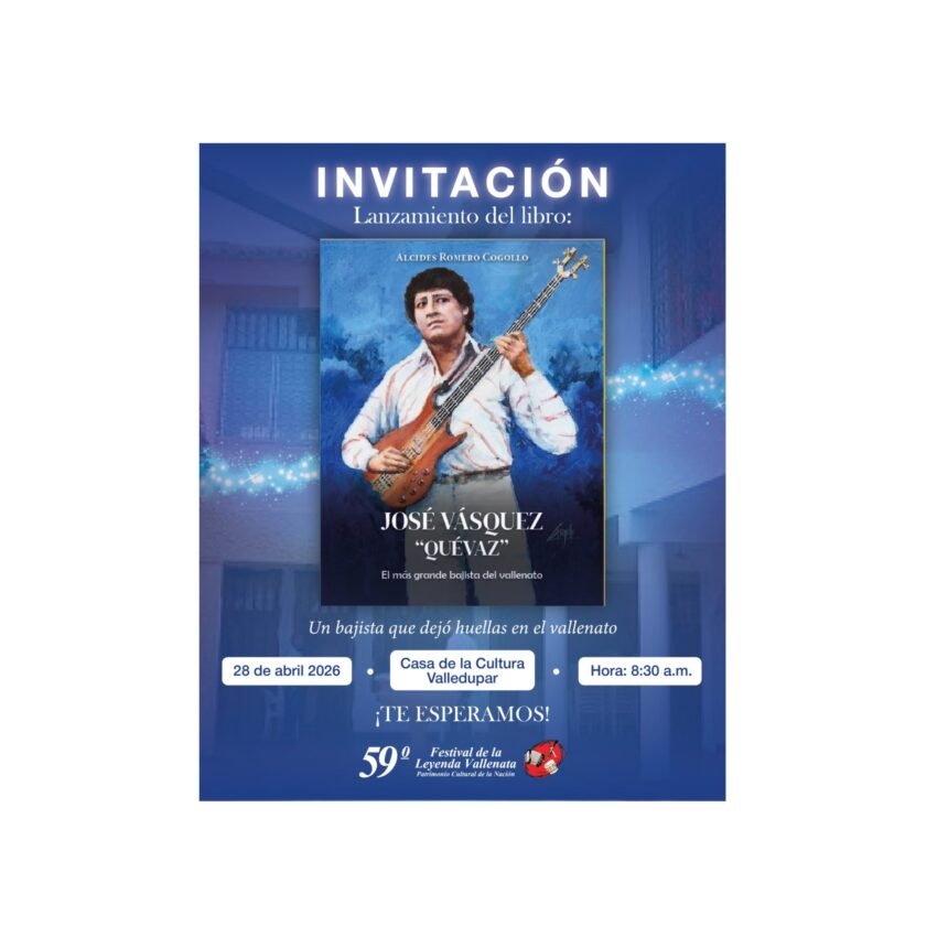 En el marco del 59° Festival de la Leyenda Vallenata, el escritor Alcides Romero presentará el libro 'José Vásquez Quevaz', una obra que documenta la vida y legado del bajista que transformó el vallenato. La presentación será el martes 28 de abril en la Casa de la Cultura de Valledupar a partir de las 8:30 a. m.
